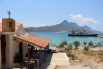 Punktualnie o godz. 10:40 wypłynęliśmy z Portu w Kisamos. Większość turystów na statku stanowiły wycieczki zorganizowane - w tym jedna z Polski. Przewodnicy na bieżąco informowali urlopowiczów o kolejnych etapach podróży. Otwarty był bar z jedzeniem i drinkami. Ceny przyzwoite (na dodatkowe promocje można liczyć w drodze powrotnej). W rytmie tanecznych przebojów przyglądaliśmy się spokojnemu morzu i skalistej linii brzegowej wyspy.